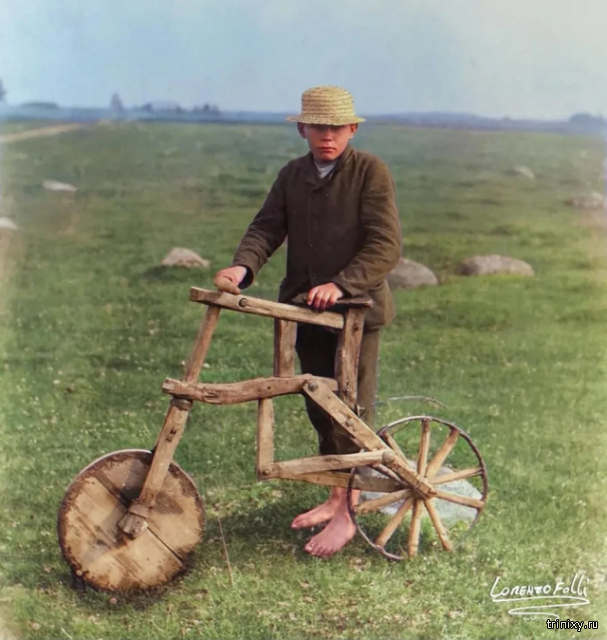 13. Юный изобретатель из Тарвасту, Эстония, на деревянном велосипеде собственного изготовления, 1912 год