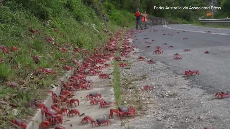 На австралийском острове Рождества началась ежегодная миграция красных крабов. Бесчисленные ракообразные устремляются по тропинкам к океану, где самки после спаривания откладывают яйца. Тогда из яиц появляются личинки, которые примерно через 30 дней превращаются в малышей-крабов и отправляются обратно к лесу.