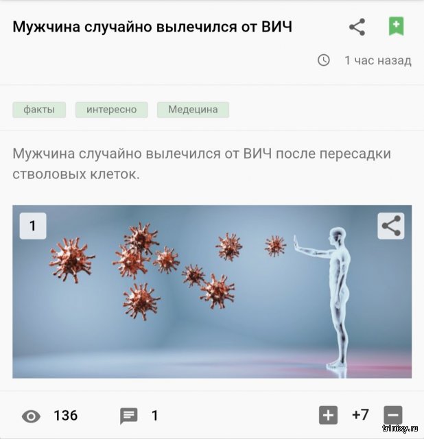 Мужчина случайно вылечился от ВИЧ wolflarcen Сегодня, 14:23 +1 # Какой познавательный пост!Браво, mmsad!