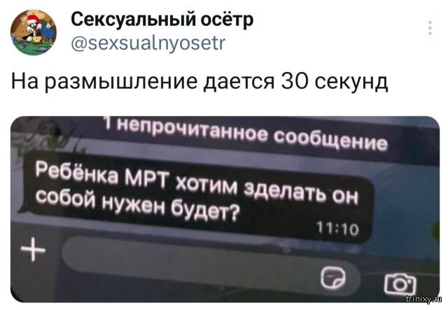 Подборка забавных твитов обо всем (15 фото) Альф11 Вчера, 01:41 0 # Какие тридцать секунд? Тут хватит пяти. Ответ: "Да"